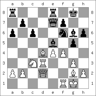 1.b3 e5 2.Bb2 Nc6 3.e3 Nf6 4.Nf3 e4 5.Nd4 Bc5 6.Nf5 g6 7.Ng3 d5 8.d3 Qe7 9.dxe4 dxe4 10.Nd2 Ba3 11.Bxa3 Qxa3 12.Ndxe4 Nxe4 13.Nxe4 Qb4+ 14.Nd2 Bf5 15.Bd3 O-O-O 16.a3 Qc3 17.O-O Ne5 18.e4 Be6 19.Ra2 Nxd3 20.cxd3 Rxd3 21.Rc2 Qxb3 22.Qc1 Qxa3 23.Rxc7+ Kb8 0-1