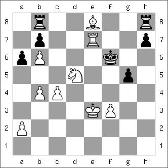 1.e4 e5 2.Nf3 Nf6 3.Nxe5 d6 4.Nf3 Nxe4 5.Nc3 Nf6 6.d4 Be7 7.Bd3 O-O 8.O-O Re8 9.Re1 c6 10.d5 cxd5 11.Bg5 Nc6 12.Bxf6 Bxf6 13.Rxe8+ Qxe8 14.Nxd5 Bd8 15.c3 Ne5 16.Be4 Bd7 17.Nd4 g6 18.Qe2 Bc6 19.g3 Nd7 20.Re1 Nc5 21.Nxc6 bxc6 22.Nb4 d5 23.Bc2 Qxe2 24.Rxe2 Bf6 25.Nxc6 a5 26.b4 Rc8 27.Ne7+ Bxe7 28.Rxe7 axb4 29.cxb4 Na6 30.Bb3 Nxb4 31.Rb7 Nd3 32.Bxd5 Rc1+ 33.Kg2 Ne1+ 34.Kh3 Rc5 35.Bxf7+ Kf8 36.Bb3 Rh5+ 37.Kg4 Nd3 38.f4 Rxh2 39.Bc4 Nc5 40.Rf7+ Ke8 41.Rf6 Kd7 42.Kf3 Rd2 43.Rf7+ Kd6 44.Rxh7 Rc2 45.Bb5 Rxa2 46.Rg7 Ra3+ 47.Kg2 Ne4 48.Rxg6+ Kc5 49.Bd7 Kd4 50.Bc6 Ra2+ 51.Kh3 Nf2+ 52.Kh4 Nd3 53.Re6 Rh2+ 54.Kg5 Rh8 55.Re8 Rh7 56.Be4 Rg7+ 57.Kf6 1-0