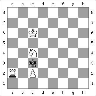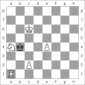 The end position of the chess problem presented by Mr. MacDonald is very similar to the solution to Puzzle No. 70 in Martin Greif's '200 Classic Chess Puzzles'. There the setup is: White Kc6, Ra1, Na4, Pc2, Pe4, Black Kb4; with the stipulation 'White to play and mate in four moves'.