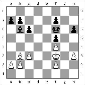 1.e4 c5 2.Nf3 Nc6 3.Bb5 g6 4.Bxc6 bxc6 5.d4 cxd4 6.Qxd4 f6 7.Qa4 Bg7 8.O-O Nh6 9.c4 Qb6 10.Nc3 O-O 11.Re1 Nf7 12.Be3 Qb7 13.Qb3 Qxb3 14.axb3 Rb8 15.Rxa7 Rxb3 16.Na4 Rb7 17.Rxb7 Bxb7 18.Nb6 d6 19.c5 e5 20.b4 Ba6 21.Ra1 Bb5 22.Nd2 Rd8 23.Ra8 Rxa8 24.Nxa8 Bf8 25.Nc7 dxc5 26.Nxb5 cxb5 27.bxc5 Nd8 28.Nb3 Nc6 29.Kf1 Kf7 30.Ke2 Ke6 31.g4 1/2-1/2