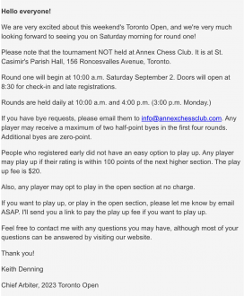 I received an email from Annex Chess Club this morning stating that "any player may opt to play in the open section at no charge". When I registered for the tournament I was under the impression that the top section would be meant for players rated 2200+ CFC, with the option for players within 100 points of the section floor to pay an extra $20 to play up.