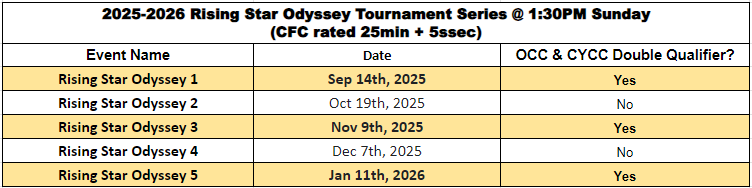 Tournaments on Sep 14th & Nov 9th & Jan 11th(2026) are OCC &CYCC Double Qualifier grouped by age.
