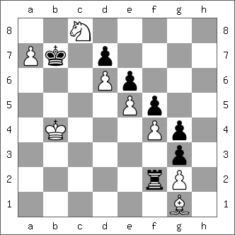 Here is the solution given with the entry: 1. Nb6! K:b6 2. a8(R) (2. a8(Q), stalemate and 2. a8(B) -/+) 2... Kc6 3. B:f2 g:f2 4. Ra1 Kd5 5. Kc3 (a) & (b) 5... Ke4 6. Kd2 K:f4 7. Ke2 K:e5 8. K:f2 K:d6 9. Ke3 Ke5 10. Ra5 d5 11. g3 +/- (a) 5. Rf1 g3 6. Kc3 Ke4 7. Kd2 K:f4 8. Ke2 K:e5 9. Kf3 f4 =; (b) 5. g3 Ke4 6. Kc3 Kf3 7. Kd3 K:g3 8. Ke2 Kg2 9. Rb1 g3 10. Rc1 Kh2 11. Kf3 f1(Q) 12. R:f1 g2 13. Rf2 Kh1 14. R:g2 =