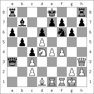 12.Bd3 Ng4 13.Rae1 Nxe3 14.Qxe3 Bxc3 15. bxc3 c4 16.Be2 Qc5 17.Nd4 Qxa3 18.Qh3 Nf6 19.Bd1